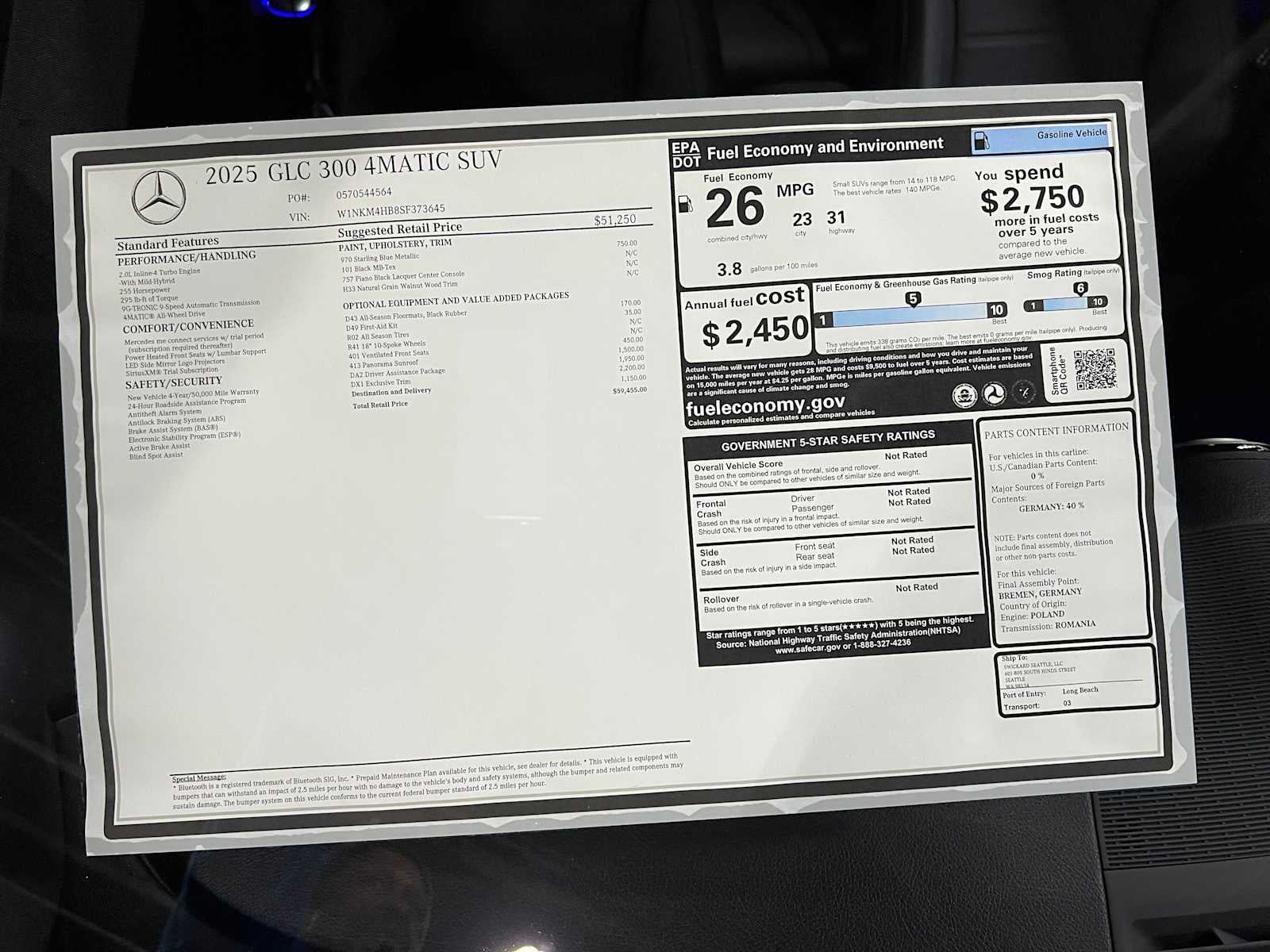 EXCLUSIVE TRIM: Surround View System, Enhanced Ambient Lighting, MB Navigation, Burmester® 3D Surround Sound System, 15 high-performance speakers, Sound Personalization, Illuminated Door Sills, GUARD 360, picture taking functionality, DRIVER ASSISTANCE PACKAGE: route-based speed adaptation, PRESAFE® PLUS, Active Lane Change Assist, DISTRONIC PLUS® w/Steering Assist, stop and go assist, PRESAFE® Brake w/Pedestrian Recognition, BAS PLUS w/Cross-Traffic Assist, Active Speed Limit Assist, PRESAFE® Impulse Side, Automatic Lane Change, Driver Assistance Package Plus, STARLING BLUE METALLIC, ALL-WEATHER BLACK RUBBER FLOORMATS (PACK OF 4)
