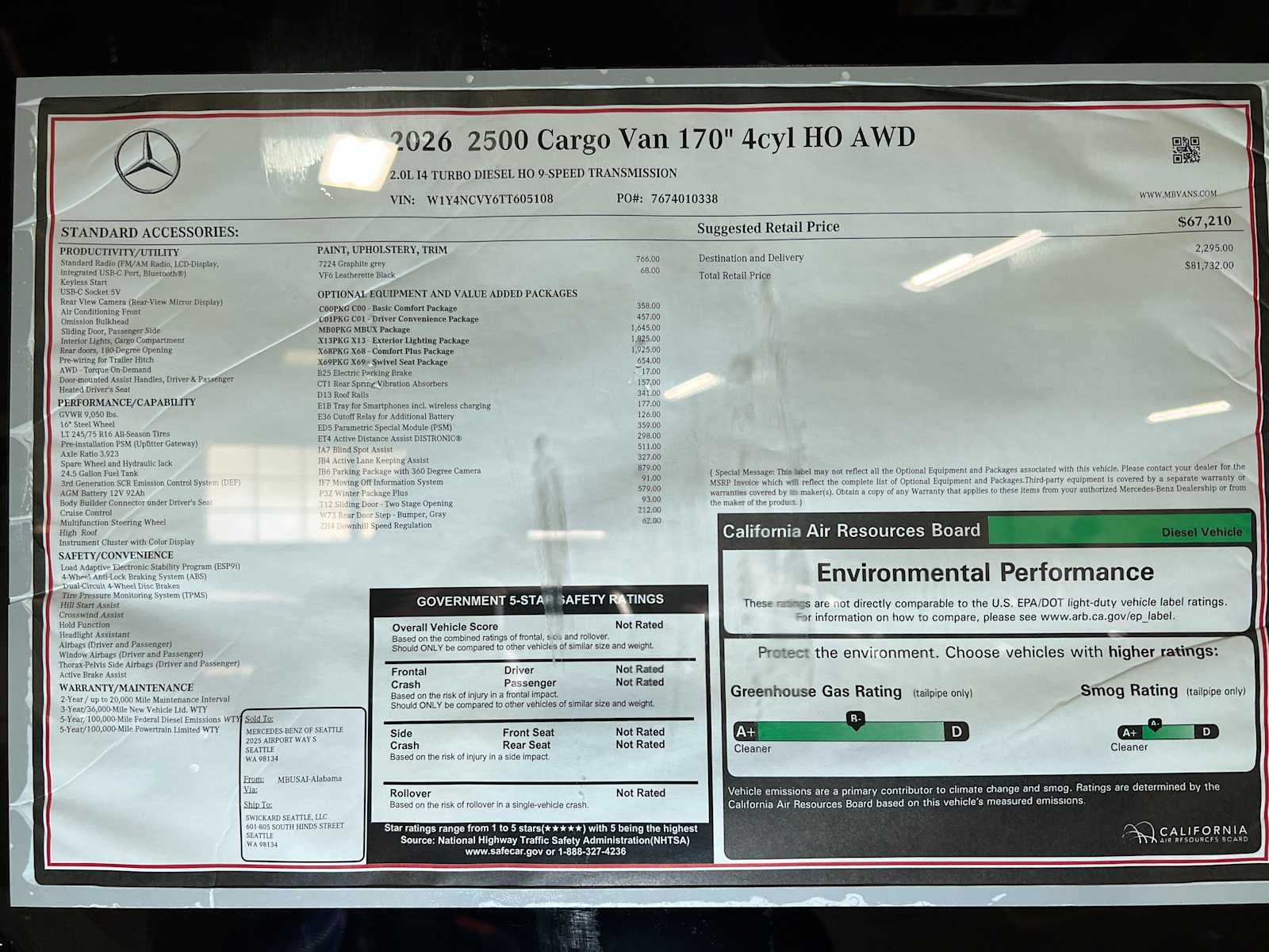 Heated Seats, Onboard Communications System, iPod/MP3 Input, Diesel, All Wheel Drive, WINTER PACKAGE PLUS, FOG LAMP W/CORNERING LIGHT FUNCTION, BLIND SPOT ASSIST. Graphite Grey exterior and Black interior, Sprinter Cargo Van trim.